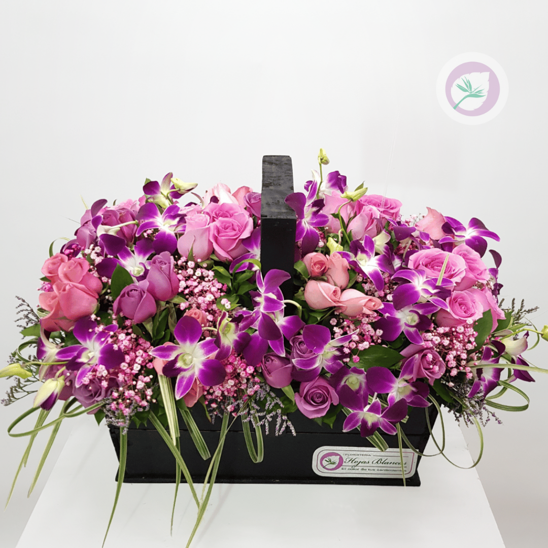 Regala una hermosa canasta en rosas variadas y orquíeas dendrobium. Tenemos los arreglos hermosos para tu persona especial en el día de su cumpleaños o en cualquier fecha especial, que quieres sorprender a aguien con unas hermosas flores.